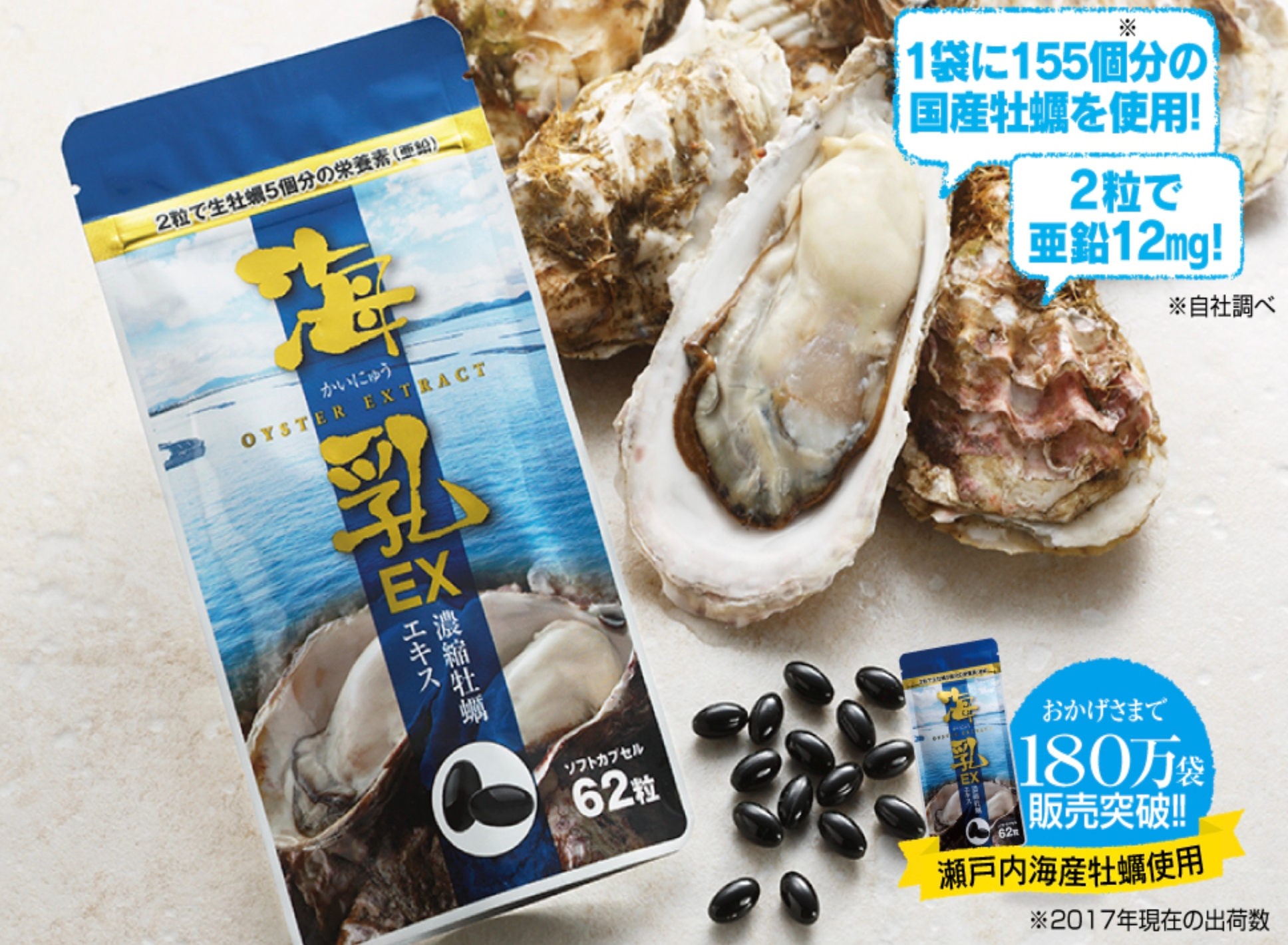 海のミルクと言われる牡蠣の栄養素を、1袋(I約1ヶ月分)に約155個分凝縮したサプリメント【海乳EX】。